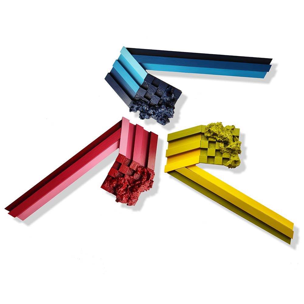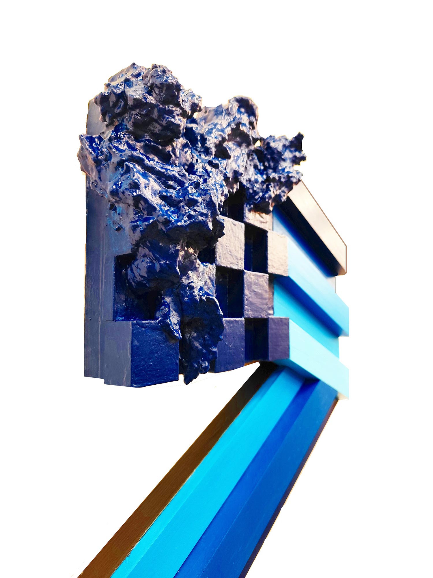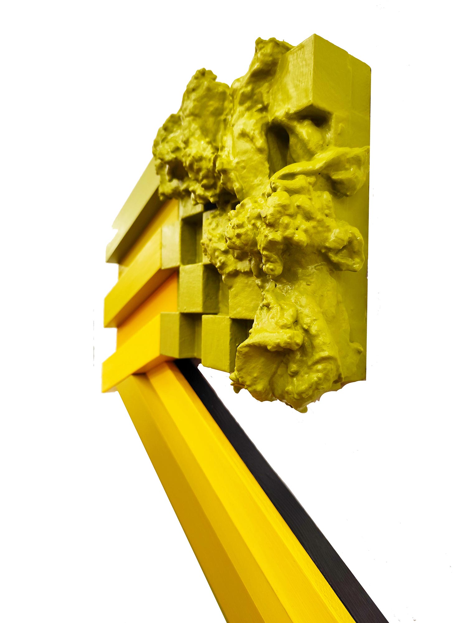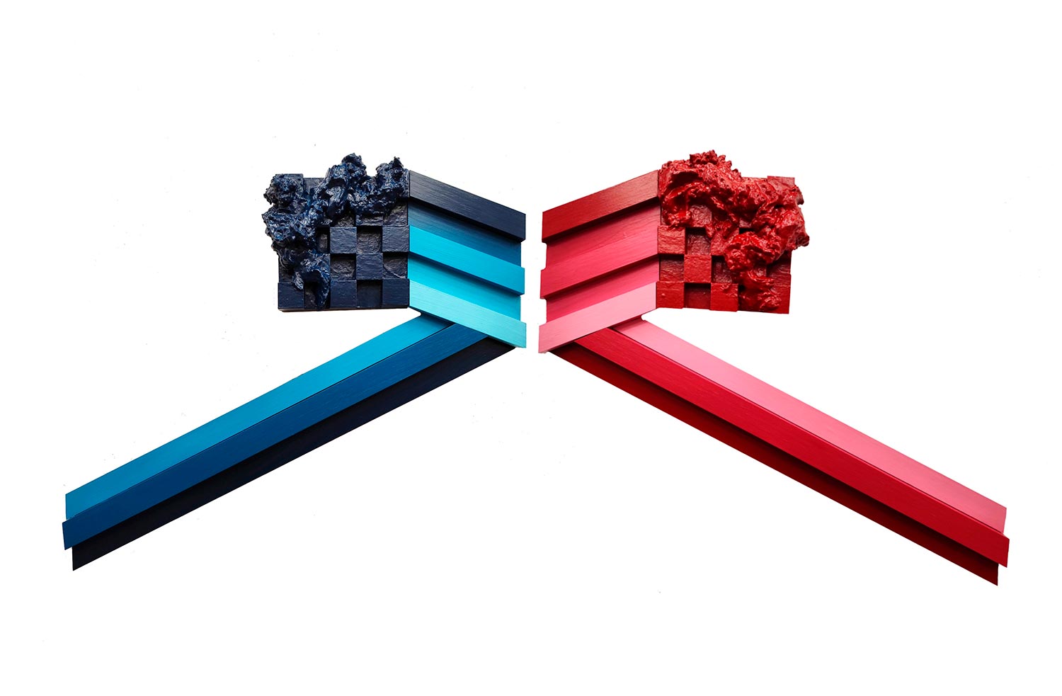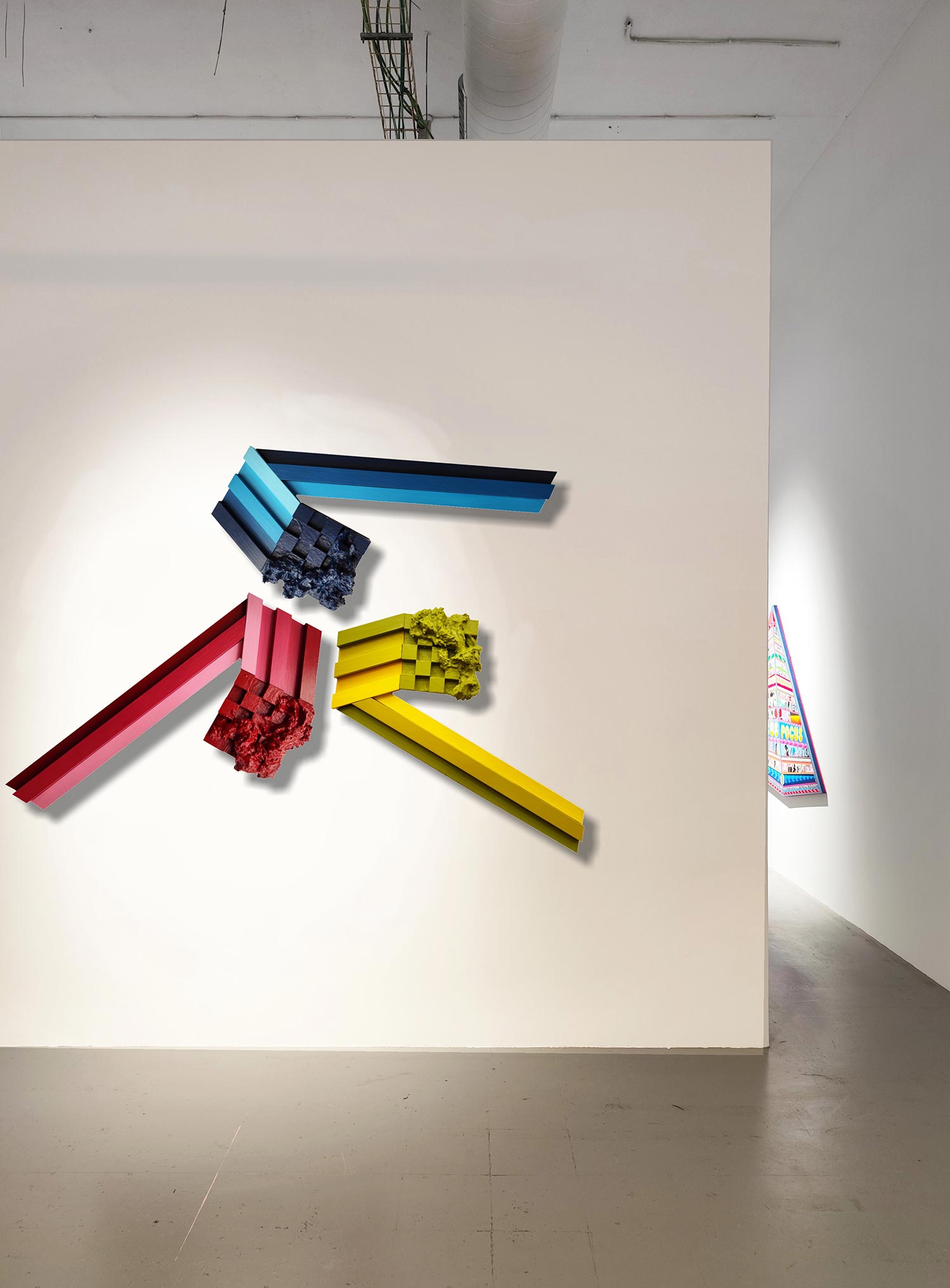 Creada a partir de bloques y listones de madera policromados con pintura Acrílica sobre tabla con bastidor, que en su pieza central lleva aplicada una pincelada de pintura matérica de gran densidad en contraste al resto de elementos.