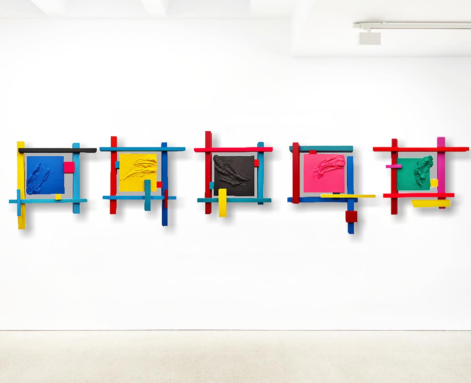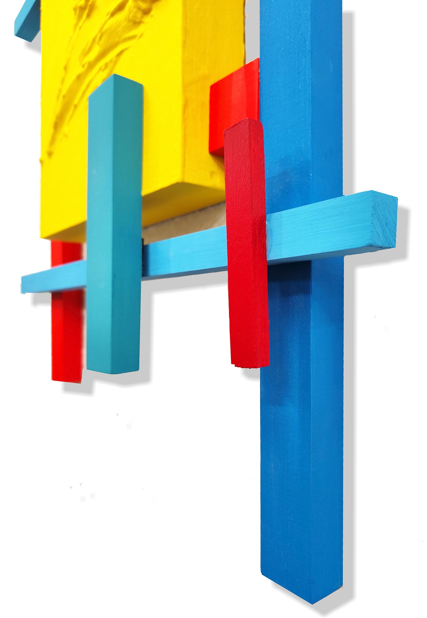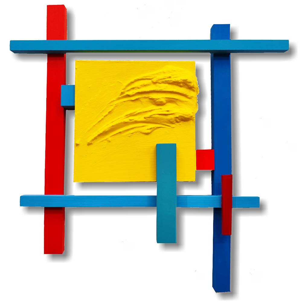 Creada a partir de bloques y listones de madera de distintas grosores y formatos policromados con pintura Acrílica sobre tabla con bastidor, que en su pieza central   lleva aplicada una pincelada de pintura matérica de gran densidad en contraste al resto de elementos.