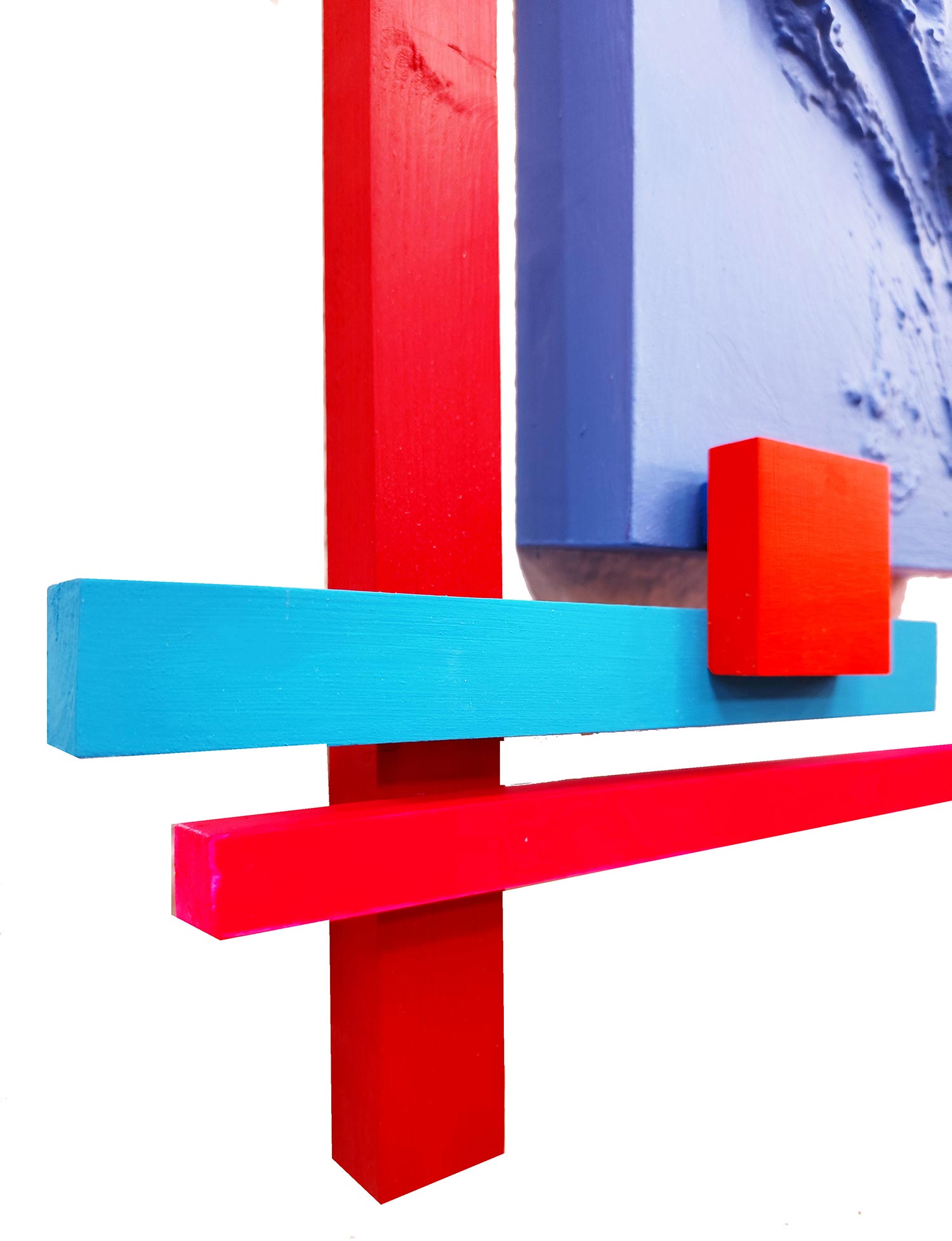 Creada a partir de bloques y listones de madera de distintas grosores y formatos policromados con pintura Acrílica sobre tabla con bastidor, que en su pieza central   lleva aplicada una pincelada de pintura matérica de gran densidad en contraste al resto de elementos.