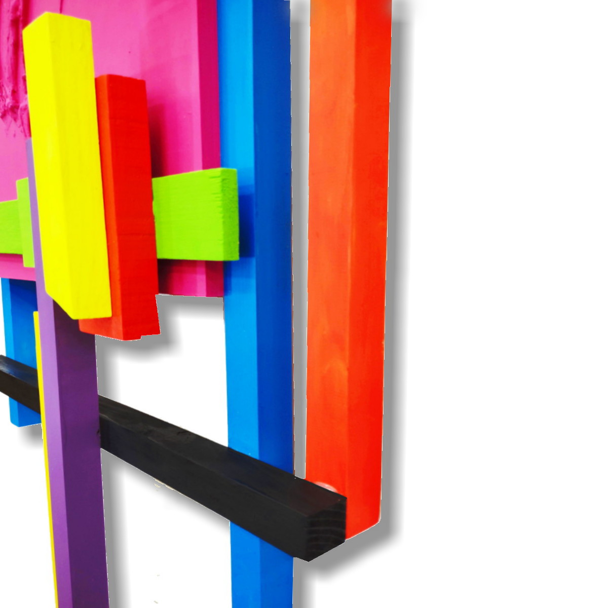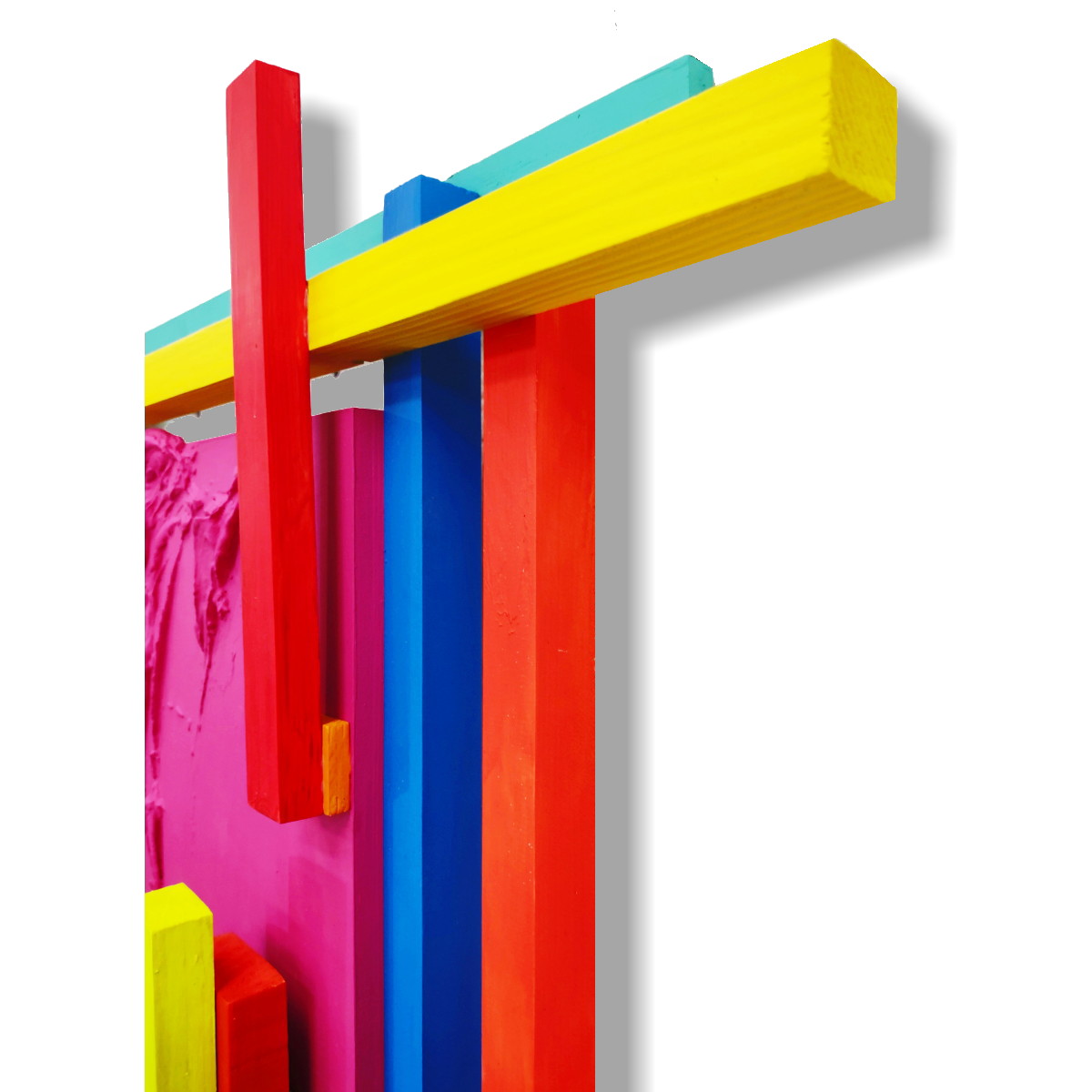 Creada a partir de bloques y listones de madera de distintas grosores y formatos policromados con pintura Acrílica sobre tabla con bastidor, que en su pieza central   lleva aplicada una pincelada de pintura matérica de gran densidad en contraste al resto de elementos. Esta pieza prescinde de marco por su propia configuración abierta y escultórica.
