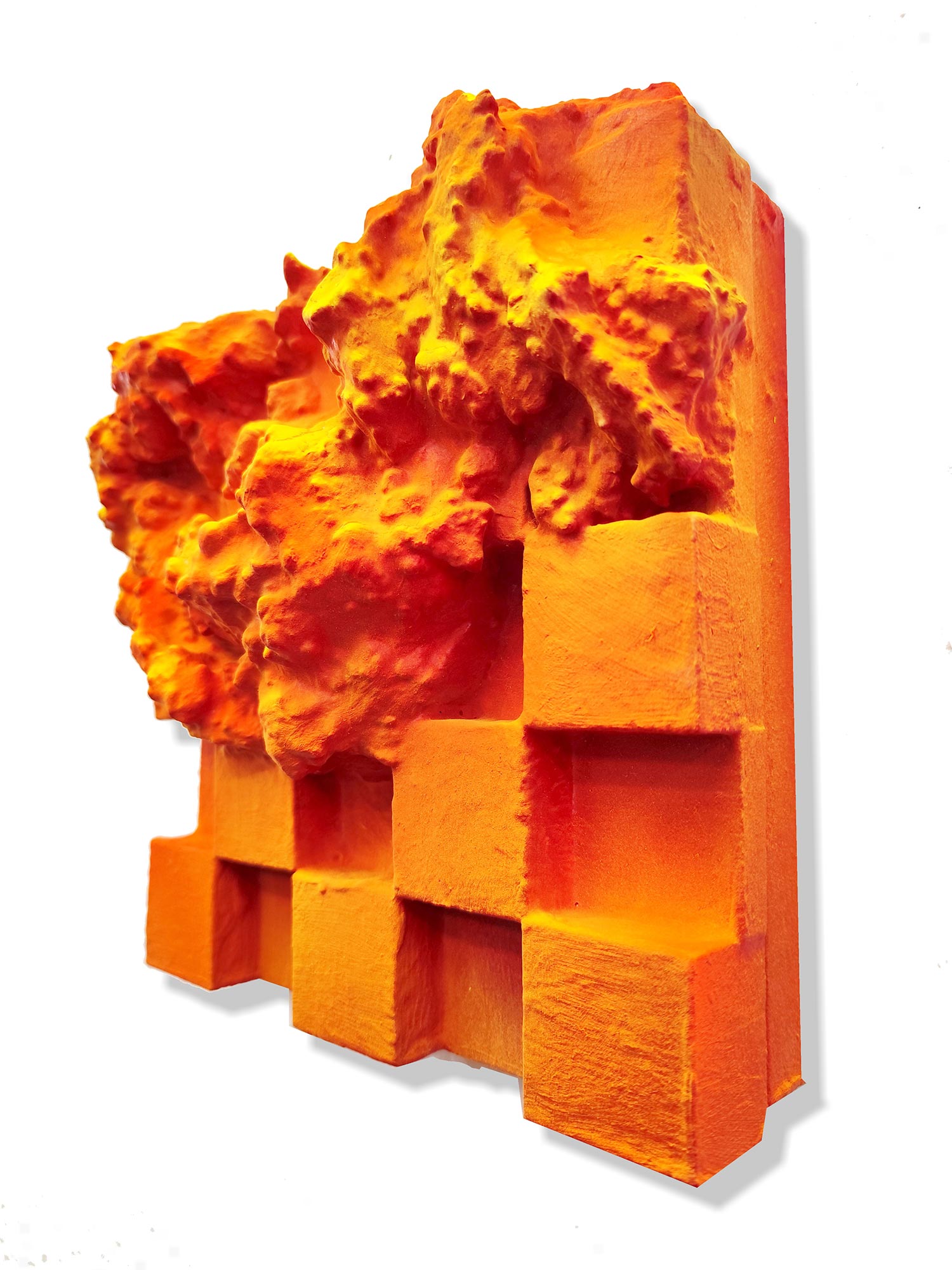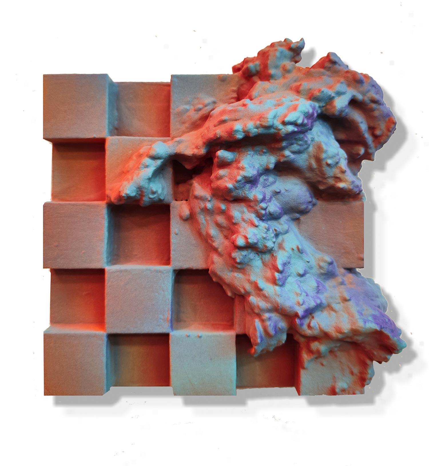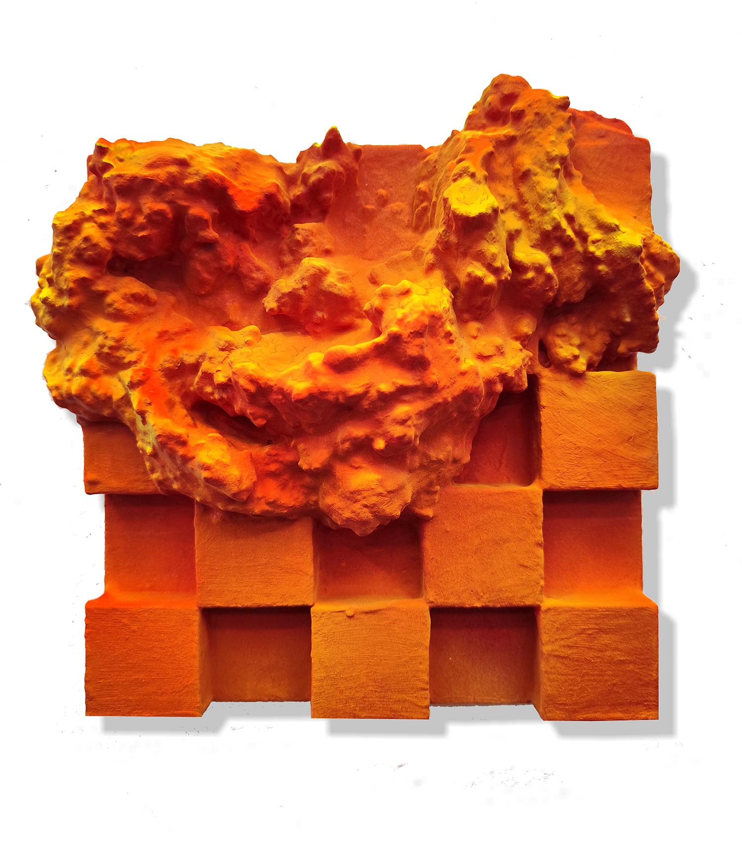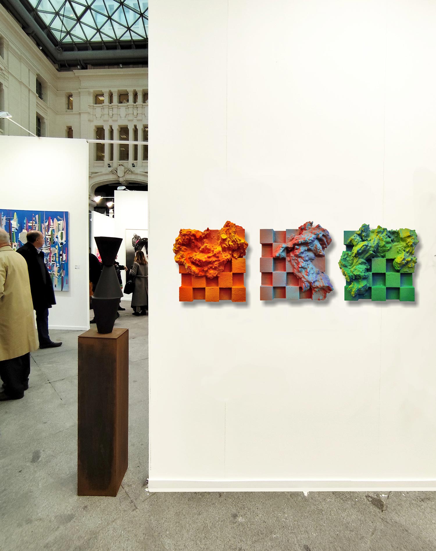 Creada a partir de bloques de madera cromados con pintura Acrílica sobre tabla con bastidor, que en su pieza central lleva aplicada una pincelada de pintura matérica de gran densidad en contraste al resto de elementos.