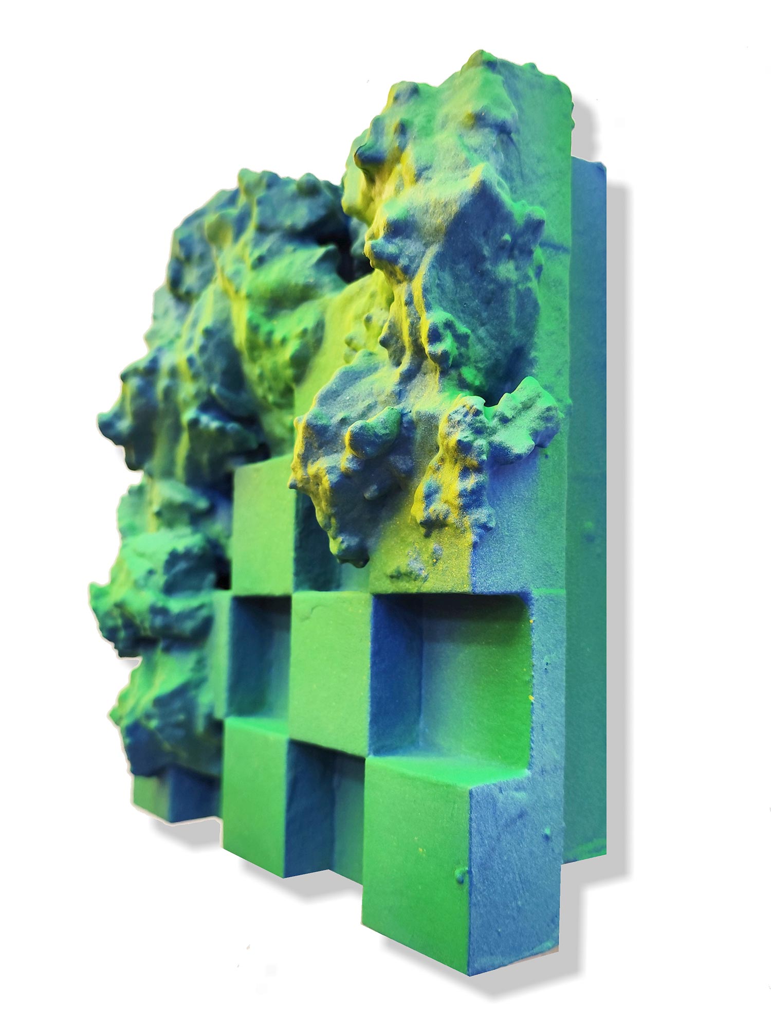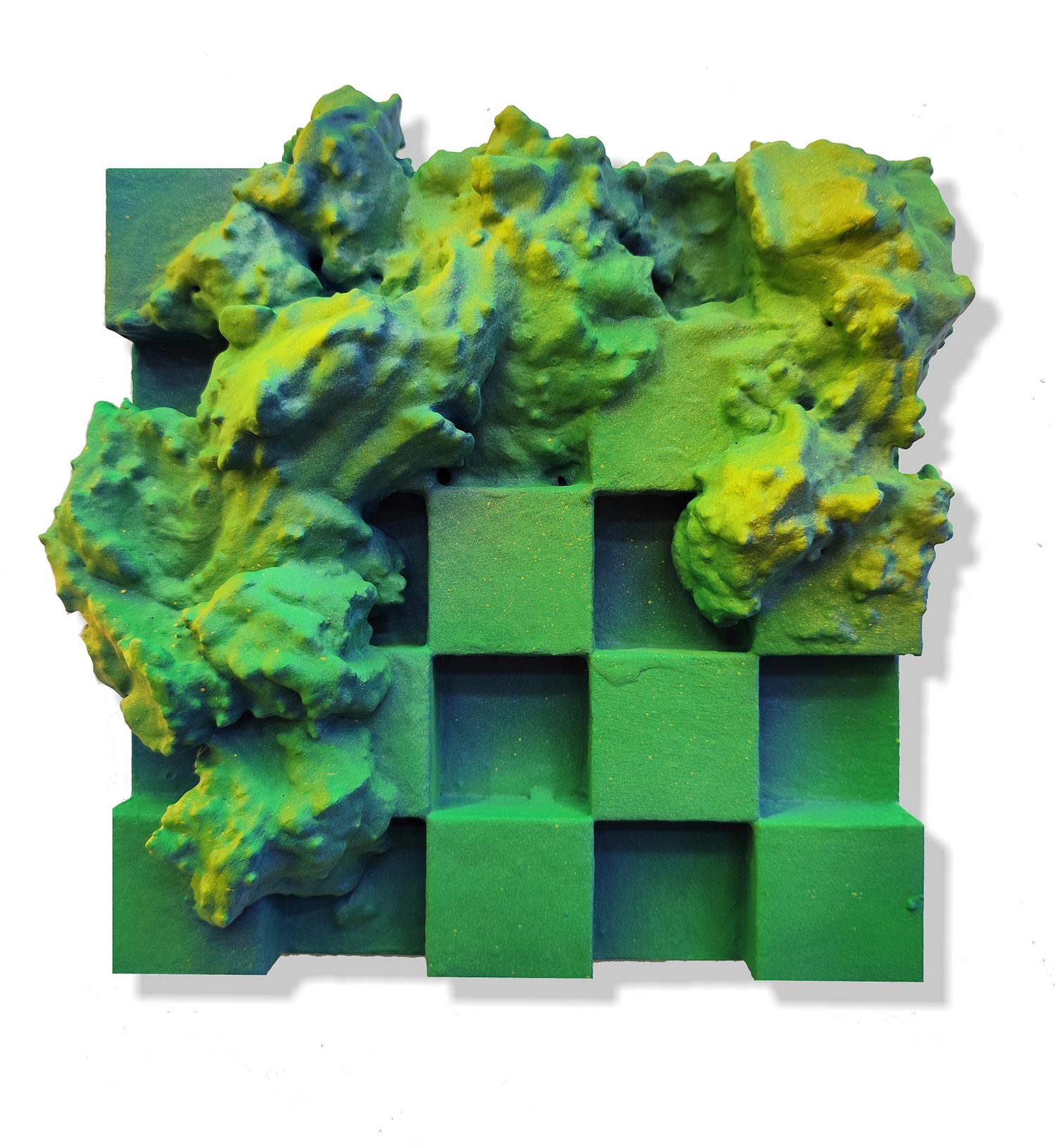 El uso de madera y cemento establece un diálogo táctil y conceptual entre lo vivo y lo inerte y pigmentos flúor evocan la vitalidad de los musgos, esa vegetación primitiva y resiliente que coloniza superficies hostiles. El color fluorescente, por su parte, introduce una capa de artificialidad que desafía la mirada del espectador, generando una atmósfera entre lo natural y lo especulativo.